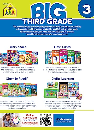 Visit the School Zone store at Amazon.com/SchoolZonePublishing. BOOK FEATURES 320 pages: 301 activity pages, 19 answer key pages For ages 8 to 9 7.75" x 10.75" pages with durable glossy cover Book has multiple sections with Parent notes for each: Writing, Math, Critical Thinking, Reading, Vocabulary The skill being practiced is listed at the bottom of each page Colorful, kid friendly illustrations reinforce the lessons Concepts and skills build upon one another, progressing from easy to more difficult Perforated pages are easy to tear out for individual worksheets AMAZING - Big Third Grade Workbook is packed with 300+ colorful exercises that make learning fun! These proven activities will help prepare your child for success. This is a great 3rd grade reading comprehension workbook, and helps children to sharpen their writing and reading skills in the parts of speech, vocabulary, persuasive writing, and punctuation workbook sections. It’s also perfect for studying 3rd grade math with the equations, fractions, estimating, symmetry, and multiplication workbook sections. Or work on history, social science, and critical thinking for kids all at once! Each section has notes for parents to help encourage learning, and concepts and skills build upon one another, progressing from easy to more difficult throughout the book. With the colorful and kid friendly illustrations and easy directions, this big 3rd grade workbook is fun and easy to use. The perforated pages make it easy to tear out and create individual worksheets, and each skill being practiced is listed at the bottom of each page to help keep track. WORKBOOKS FOR KIDS - Using kids workbooks is a great way to improve learning. Writing by hand, as opposed to typing on a computer, fires up specific areas of a child's brain, improving their ability to not only remember what he or she learns but to think of new ideas. Completing physical pages also give a sense of accomplishment that’s hard to get from a digital product. This is a workbook kids are sure to enjoy! PREPARATION - Let us help you prepare your young children for the next grade level with our workbooks, flashcards, card games, early reading books, and online learning program – Anywhere Teacher. Keep kids "classroom ready" with these great supplemental learning tools and more! AWARD WINNING - School Zone content has won The Parents’ Choice Foundation Award, Tillywig Toy Awards, Brainchild Award, Family Choice Award, Mom's Choice Awards Honoring Excellence, Gold Star Toy Scholastic Parent and Child Award and many more. OUR STORY - More than 40 years ago, long-time educators James Hoffman, Ed.D., and his wife Joan Hoffman, M.A., began a retail supply outlet for teachers, then soon identified a need for at-home learning materials to help parents support and supplement their children’s classroom instruction. School Zone Publishing fast emerged as the market leader in workbooks and flashcards for preschoolers through sixth graders. School Zone remains family-owned, focused on excellence, responsive to customers, alert to emerging technology, and committed to the community. We continually update our products with new features and content, reflective of changing standards, evolving teaching methods, and overall best practices.
