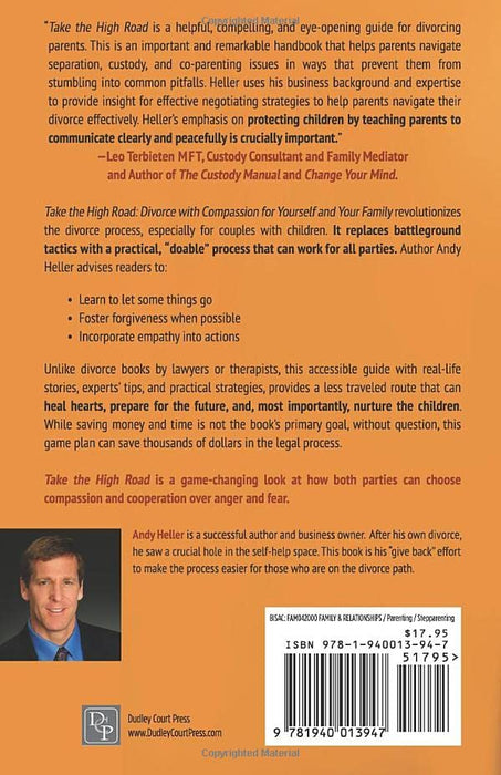 Game-changing guide to divorce. "Taking the high road" means learning to let some things go, fostering forgiveness when possible, and incorporating empathy into actions that affect your former life partner. - Andy Heller, author and divorced dad If you find yourself in the stressful world of divorce – whether you are considering separation, are in the midst of the process or coming out the other side, Take the High Road: Divorce with Compassion for Yourself and Your Family will help replace battleground tactics with a healthy, supportive process that can work for all parties. Unlike primers on divorce written by lawyers, therapists, and other subject-matter experts, this accessible and revolutionary guide comes from a successful businessman and author of popular books on real estate and investments. As Andy Heller struggled through his own divorce, he searched for a practical roadmap to help him, his wife, and his children navigate the emotional, logistical, legal and financial challenges. Finding nothing to help, Heller began interviewing dozens of divorcing couples, marriage counselors, attorneys, judges, and others who could shed light on divorce universal difficulties. The result: a game-changing look at how both parties can choose compassion and cooperation over anger and fear. Acknowledging the high emotional stakes and the high odds of divorce half of today’s marriages end in dissolution Heller has written what one marriage and family therapist calls "a manual of best practices for getting through one of life’s more difficult transitions." With blunt advice, real-world examples, and 46 practical strategies, this book is a well-organized roadmap to a more positive destination. It provides a less traveled route for navigating a divorce that can heal hearts, prepare for the future, and, most importantly, nurture the children. Step-by-step, Heller’s game plan walks readers through four stages: Divorce Structure, Strategy, and Goals Action Steps to Help Your Children Manage Life’s Changes Don’t Forget about Your Own Needs When Divorcing Healthy Dealings with Your Ex Within those areas, core "strategy" chapters incorporate engaging anecdotes, original insights, and tips from experts. Readers will be empowered with invaluable communication tools designed to lower the temperature of flashpoint discussions and situations. The author even provides "scripts" for dealing with difficulties before debates can arise. Checklists give readers concrete action plans, and clear "Takeaway Points" at the end of each chapter reinforce key messages. Heller writes about incompatibility and other interpersonal problems, but doesn’t shy away from tough topics including emotional and physical abuse, infidelity, and restraining orders. Every divorce is different in its own way. Despite differences, however, most divorcing spouses share the same challenges. Readers will find common ground on subjects all too frequently overlooked in other books on divorce: Avoid Unilateral and Wish-List Expenses Therapy Curveballs Visualizing Your Post-Marriage Home Beware of Button-Pushing Events The Two Categories of Advice-Givers When and With Whom to Speak about Your Ex Where is My Deserved Affirmation or Appreciation? Take the High Road will be essential reading not only for men and women contemplating or going through divorce, but also for their friends, loved ones and the financial and legal professionals in their lives. It’s a roadmap for a better life journey with more happiness along the way.