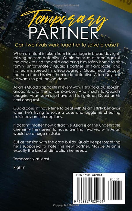 Can two rivals work together to solve a case? When an infant is taken from his carriage in broad daylight, missing persons detective, Quaid Valor, must race against the clock to find the child and bring him safely home to his family. Unfortunately, Quaid’s partner isn’t available, and his team is spread thin. Begrudgingly, Quaid must accept the help from his rival, homicide detective Aslan Doyle, if he wants to get the job done. Aslan is Quaid’s opposite in every way. He’s bold, outspoken, arrogant, and the office playboy. And much to Quaid’s chagrin, Aslan seems to have set his sights on Quaid as his next conquest. Quaid doesn’t have time to deal with Aslan’s flirty behavior when he’s trying to solve a case and juggle his cheating ex’s incessant interruptions. It doesn’t matter how attractive Aslan is or the undeniable chemistry they seem to have. Getting involved with Aslan would be a huge mistake. But as tension with the case builds, Quaid keeps forgetting he’s supposed to hate this new partner. Maybe Aslan is exactly the kind of distraction he needs. Temporarily at least. Right? **Temporary Partner is the first in the Valor and Doyle Mysteries. Please view any trigger warnings by using the Look Inside feature**
